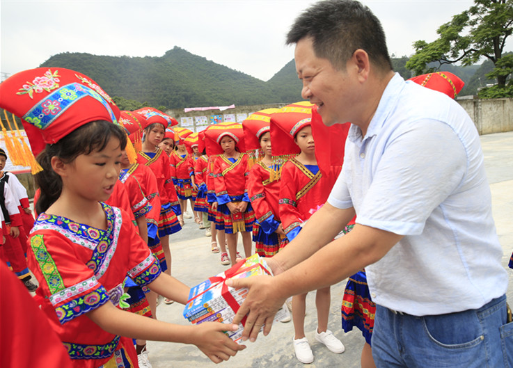 图为天等县纪检监察干部给东平镇中心小学学生捐赠书籍。