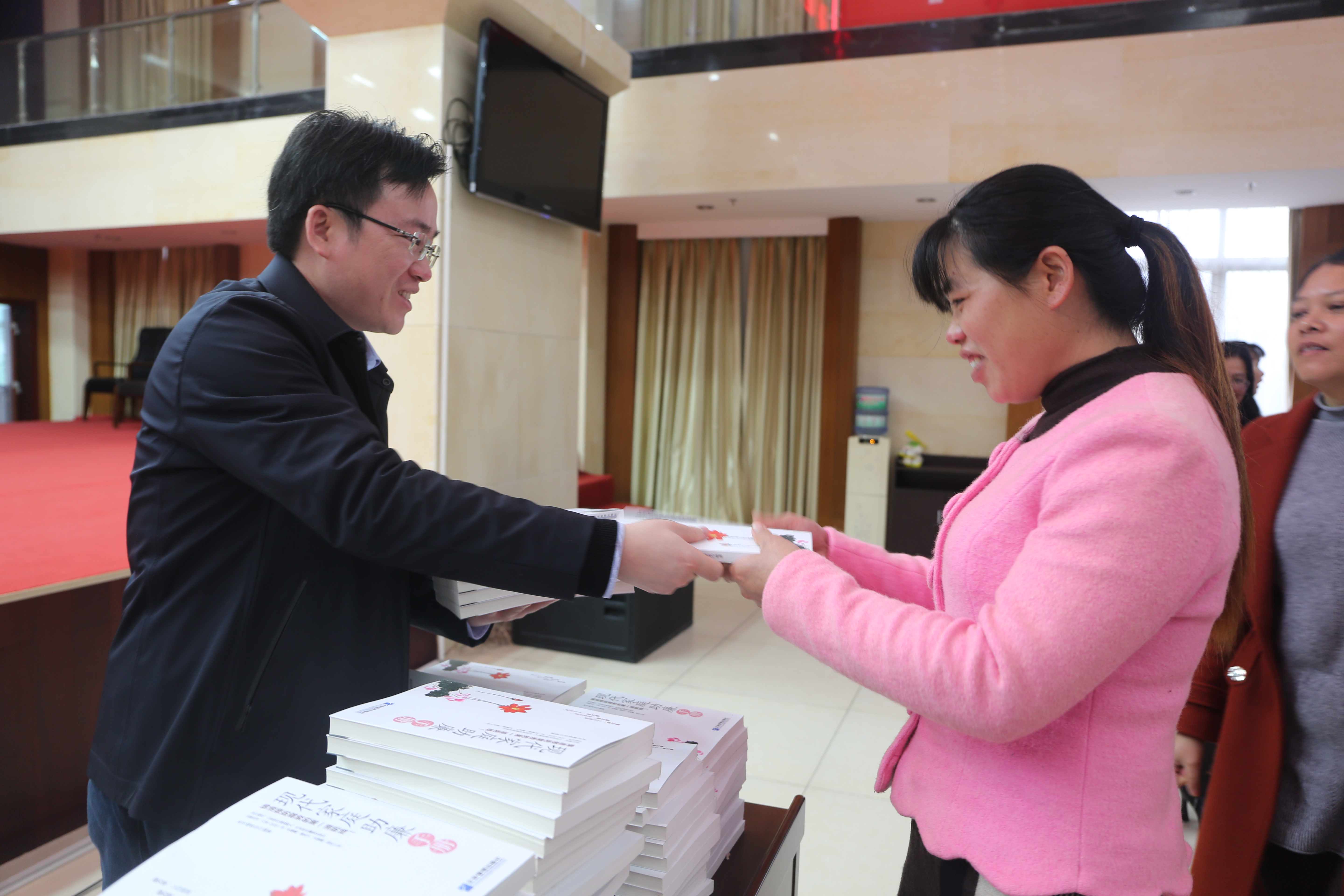 3月8日,天等县举办“树廉洁家风 建幸福家园”活动。上图为县委常委、县纪委书记、县监察委主任周春科(左)给领导干部家属赠送《家庭助廉手册》。
