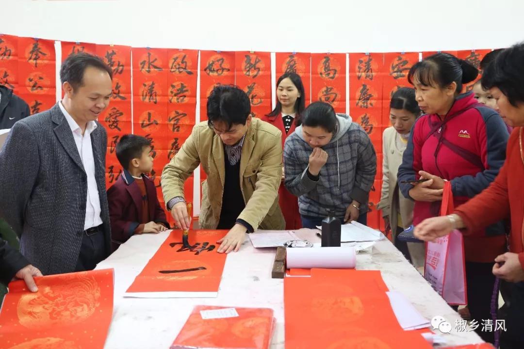 图为纪检监察干部、书法爱好者现场为搬迁群众写春联。