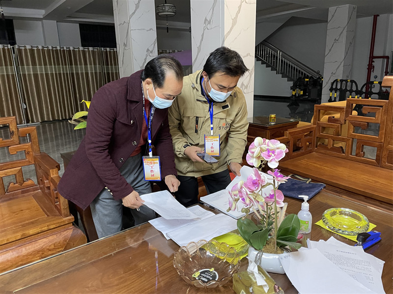 图为福新镇纪委到舒亨民宿督查疫情防控工作。