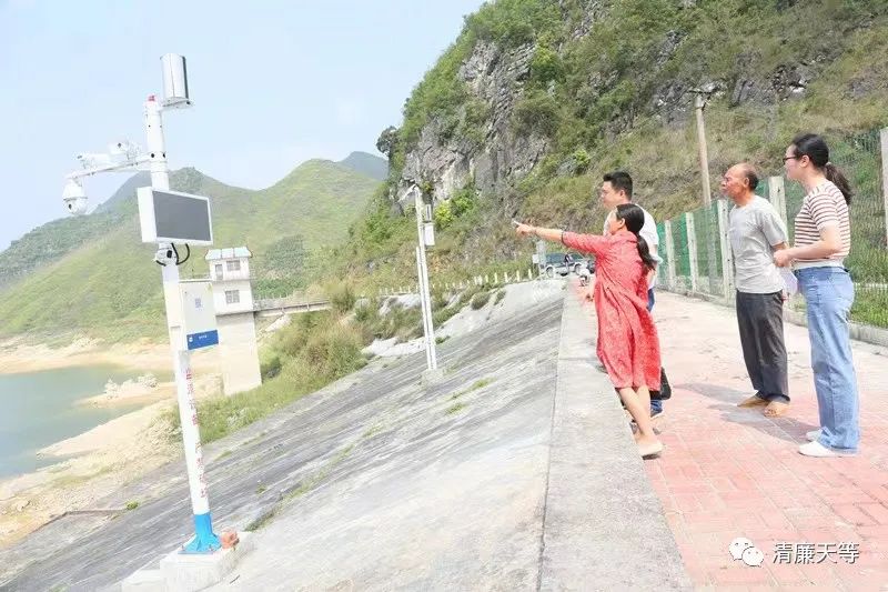 图为县纪委监委驻农业农村局纪检监察组在宁干乡伏漫水库督查水库安全监测系统运行情况。