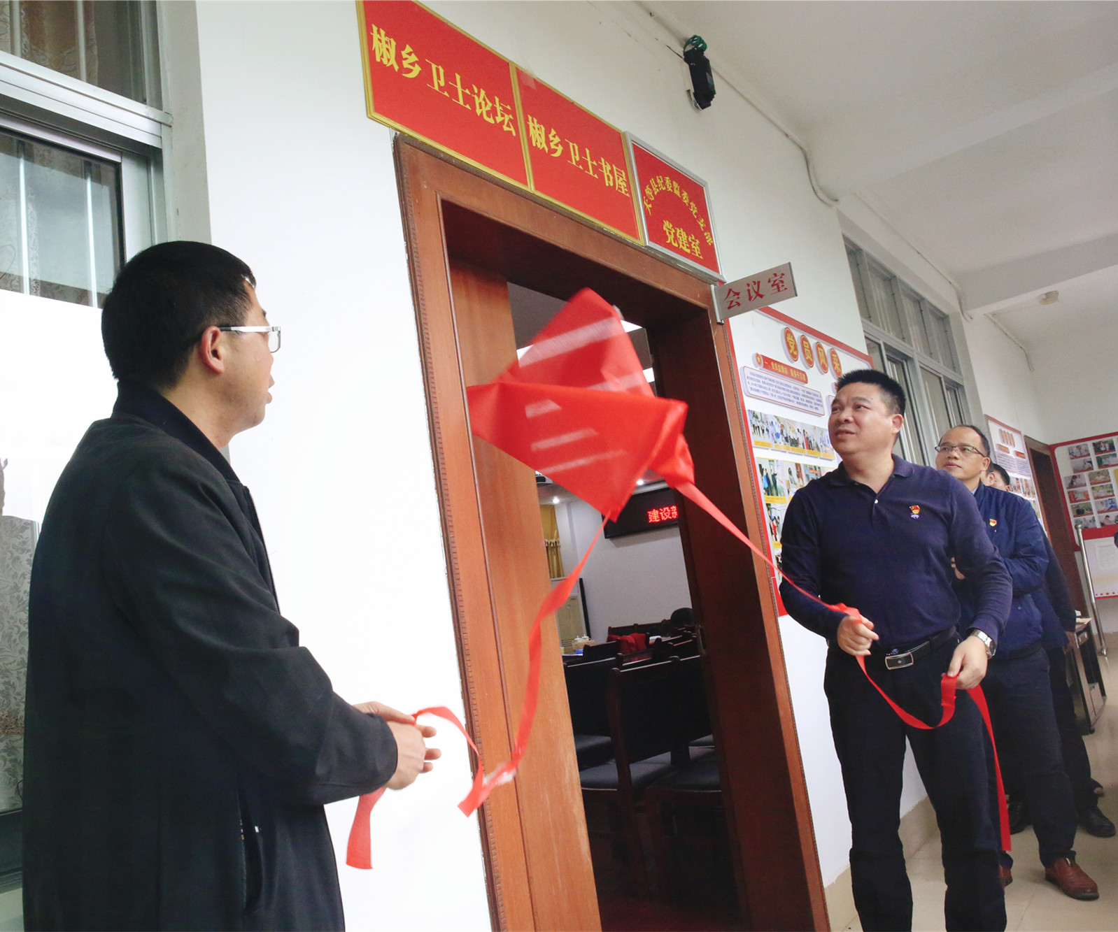 图为县委常委、纪委书记、监委主任黄玉书(左二)与县纪委副书记、监委副主任许明华(左一)为“椒乡卫士书屋”、“ 椒乡卫士论坛”揭牌。