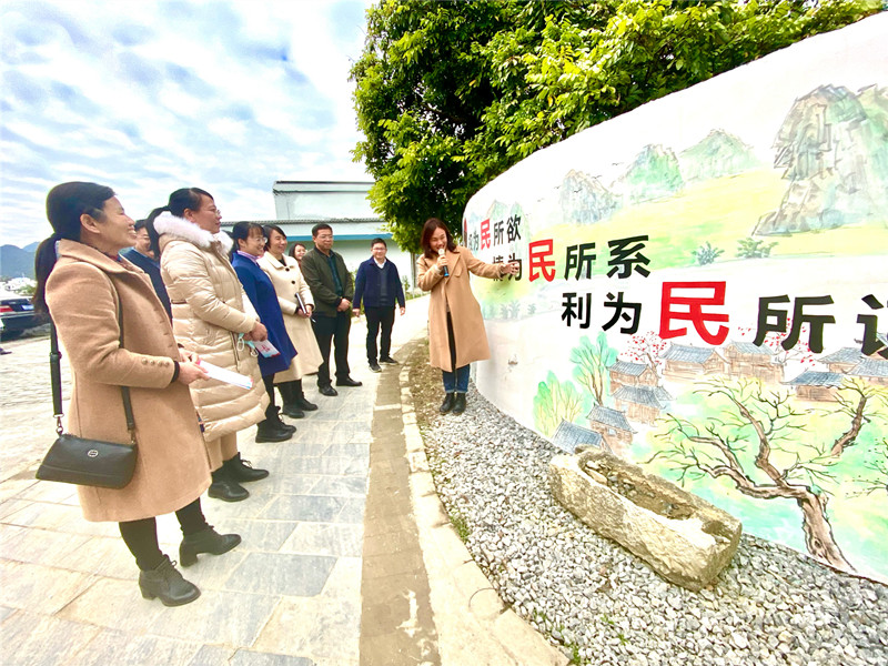 图为县纪委监委干部参观都康乡清风岩屯廉政文化墙。
