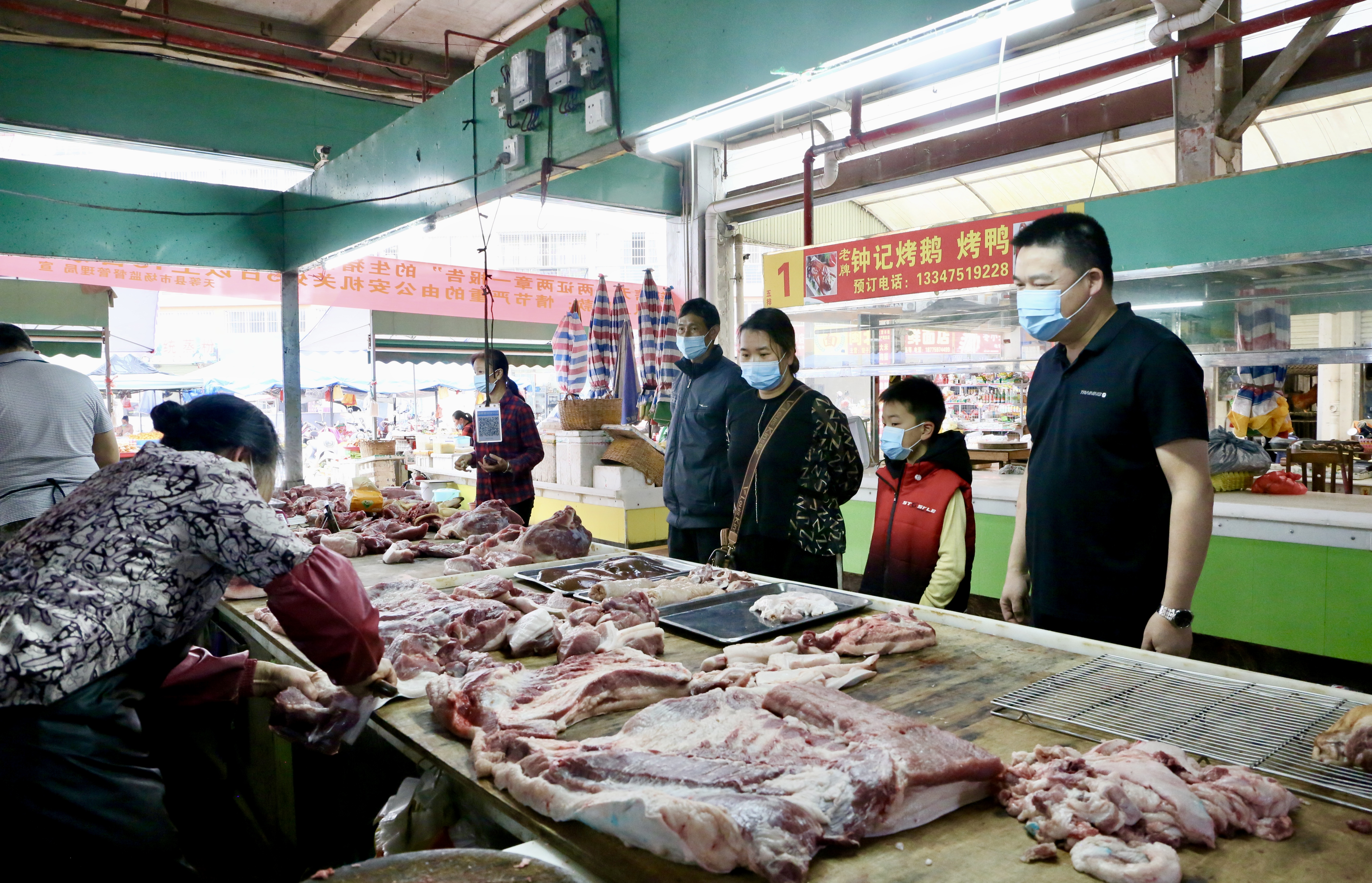 在万民农贸市场,黄玉书与个体工商户详细交谈,了解猪肉市场价格及供应情况,并嘱咐商户要严格落实防疫措施,规范戴好口罩。