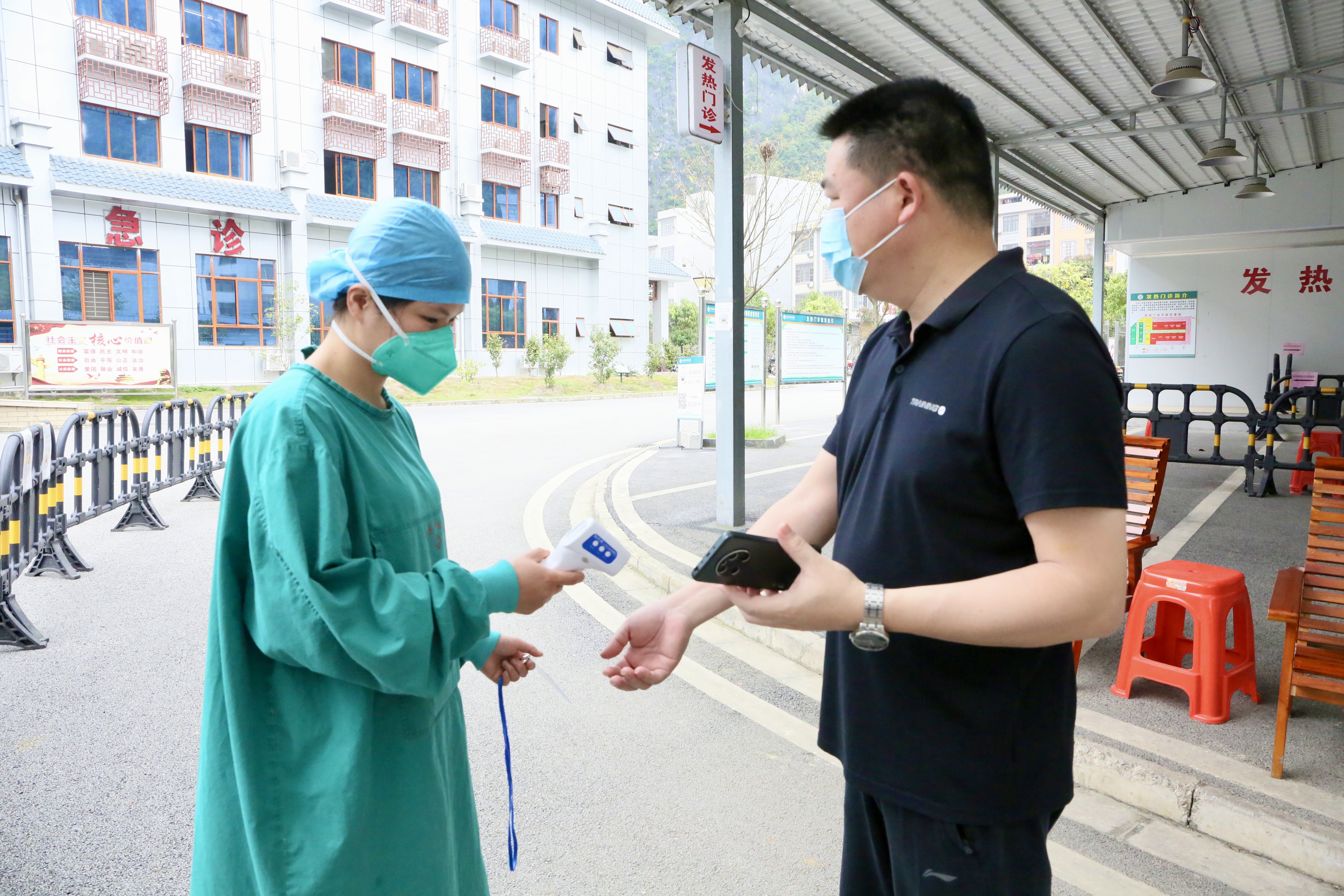 图为县委常委、纪委书记、监委主任黄玉书(右)就疫情防控工作落实情况到县中医院进行督查暗访。
