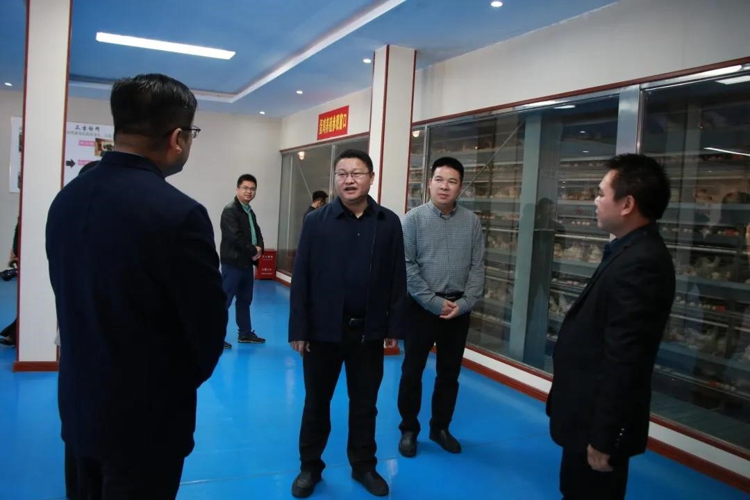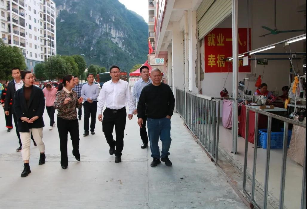 图为覃子骅(前右二)在龙岩易地搬迁小区扶贫车间调研