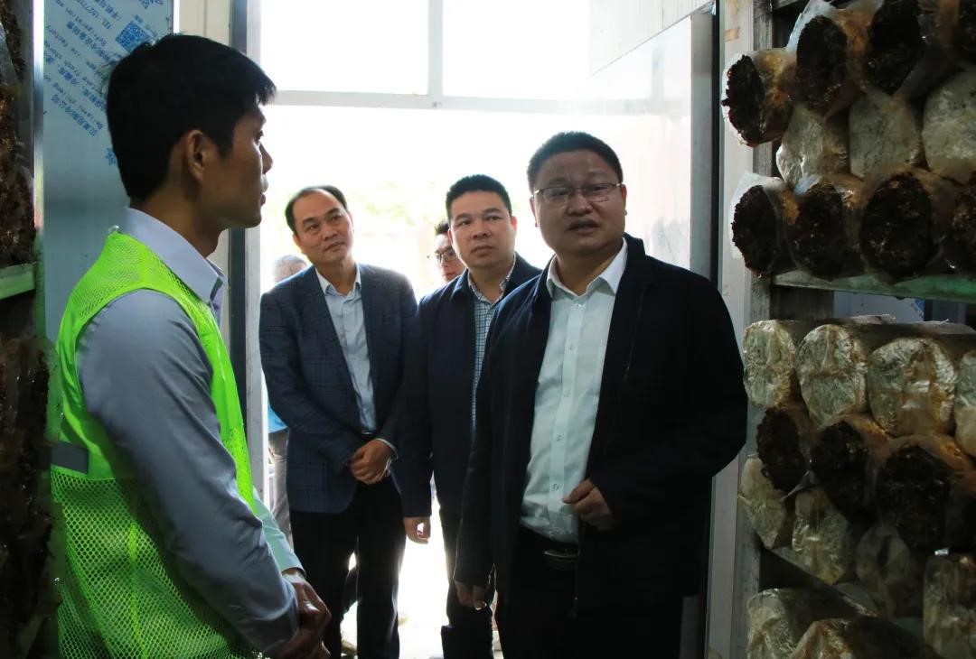 图为覃子骅(右一)在爱乐村食用菌种植基地了解食用菌产业发展情况