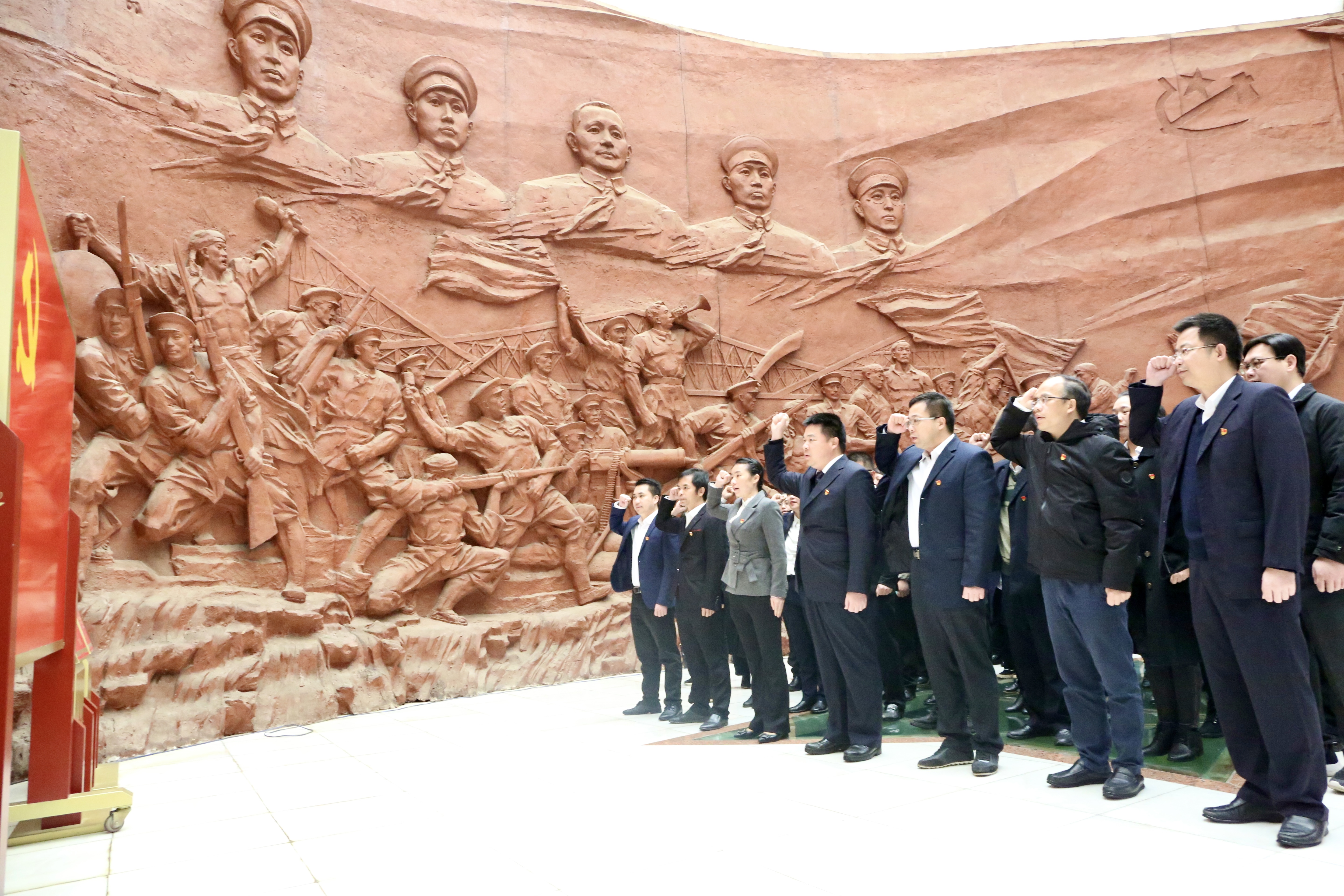 当天活动的第一站,党员同志们来到了龙州起义纪念馆。在县委常委、县纪委书记、县监委主任黄玉书的带领下,全体党员在革命烈士纪念碑前整齐列队,面向党旗举起右手,庄严宣誓,重温入党誓词。铿锵有力的誓词,久久激荡在每一名党员心中,激励着他们始终牢记对党的承诺,牢记党员的职责和使命。随后,党员同志们走进纪念馆展厅,认真聆听讲解员讲述红八军浴血奋战的革命历史,通过观看丰富翔实的文字、图片等历史资料和珍贵的革命文物,追思英雄情怀,用心感悟革命先烈、建国英才的英勇事迹。