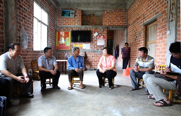 在贫困户家中,梁日端(右三)于贫困户交谈。